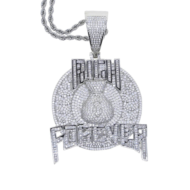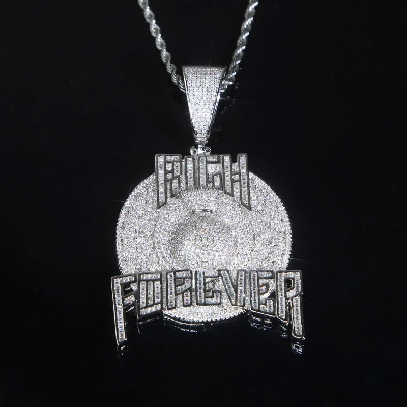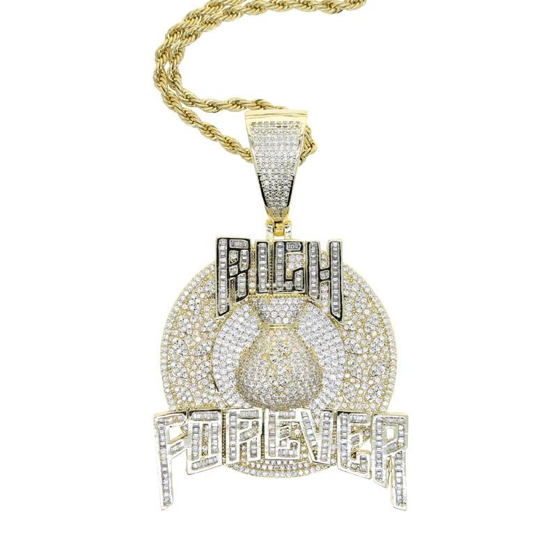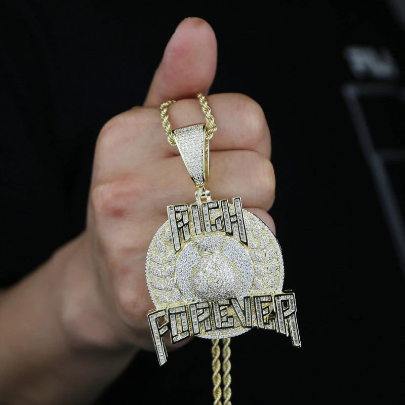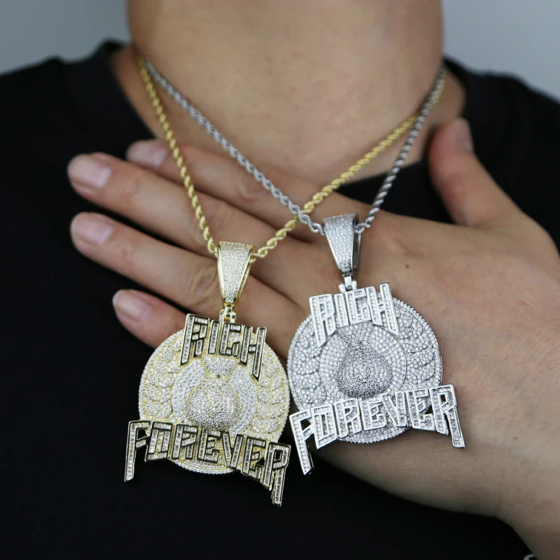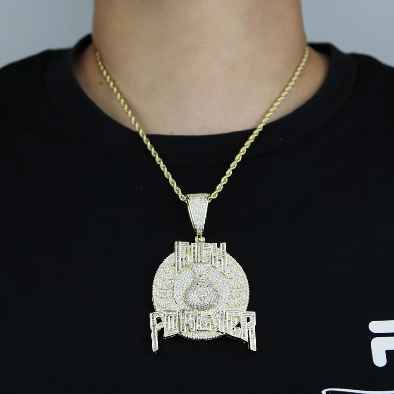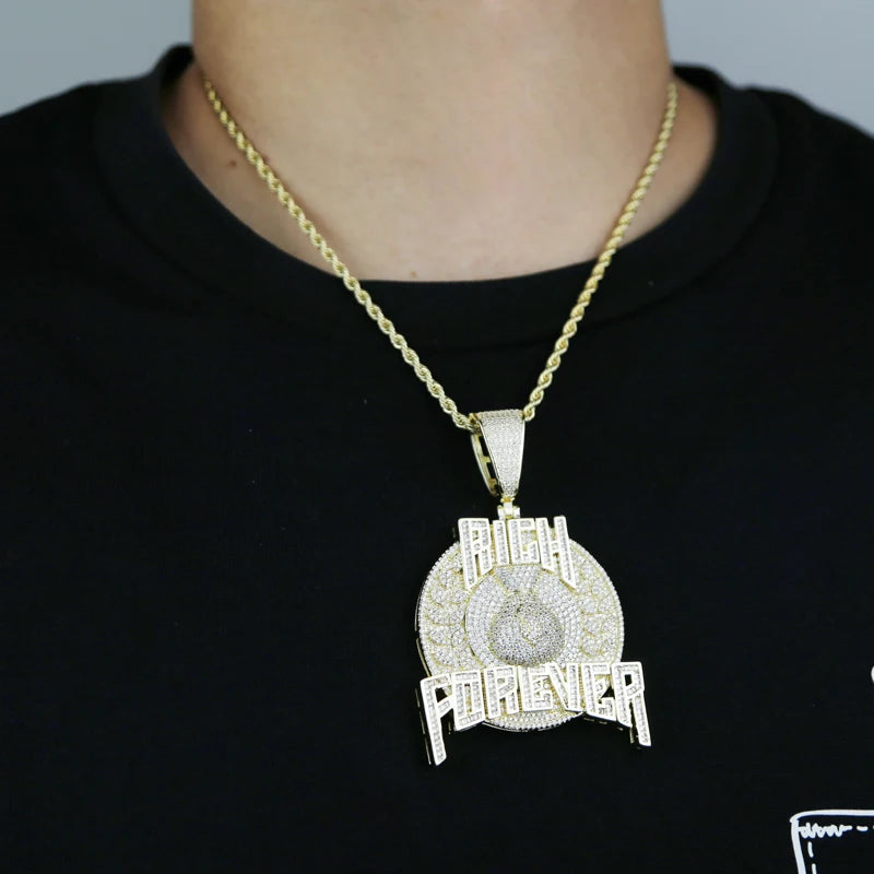 Bling Cz Letter Iced Out Prong Setting Rich Forever Pendant Necklace for Men Gold Color Hip Hop Jewelry