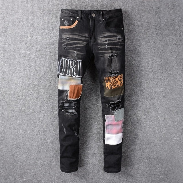 Fashion Patch Ripped Blue Jeans Men Slim Fit Designer Washed Denim Jeans Trousers Men Hip Hop DJ Party Jeans Punk Rock Pants