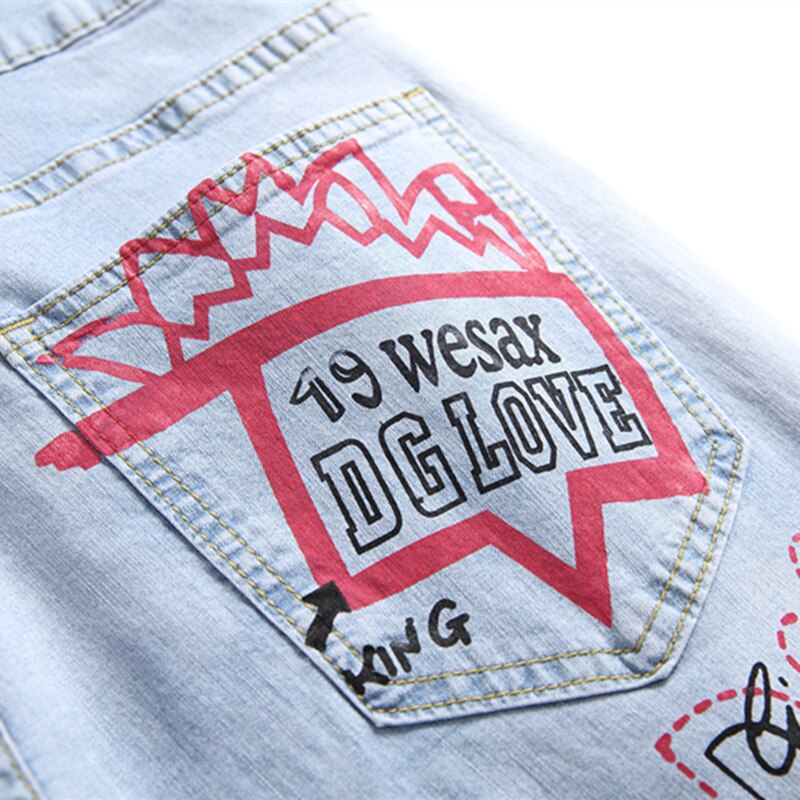 High Street Fashion Light Colored Hole Jeans 3D Printed Stretch Denim Pants Men Slim Spring Summer Trousers