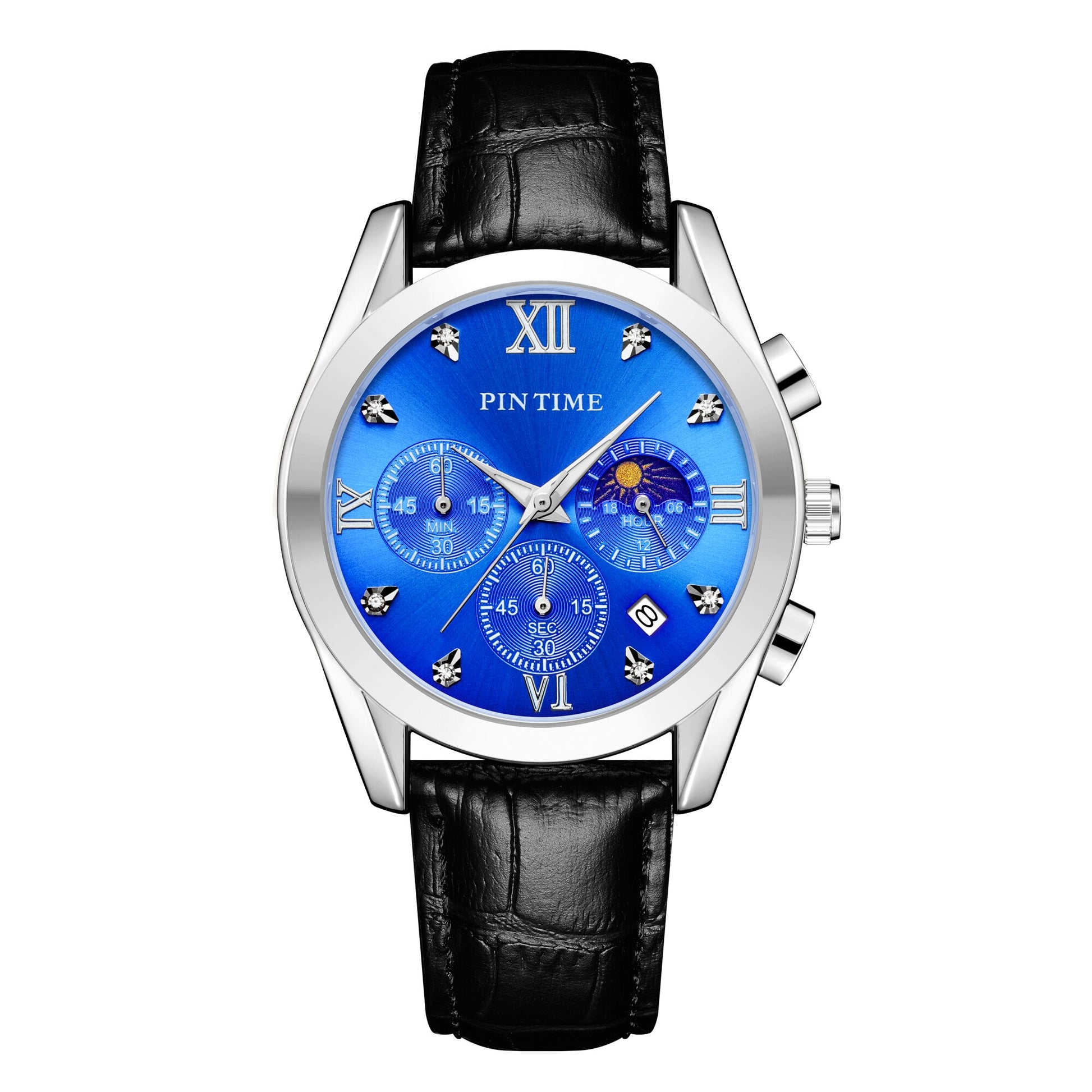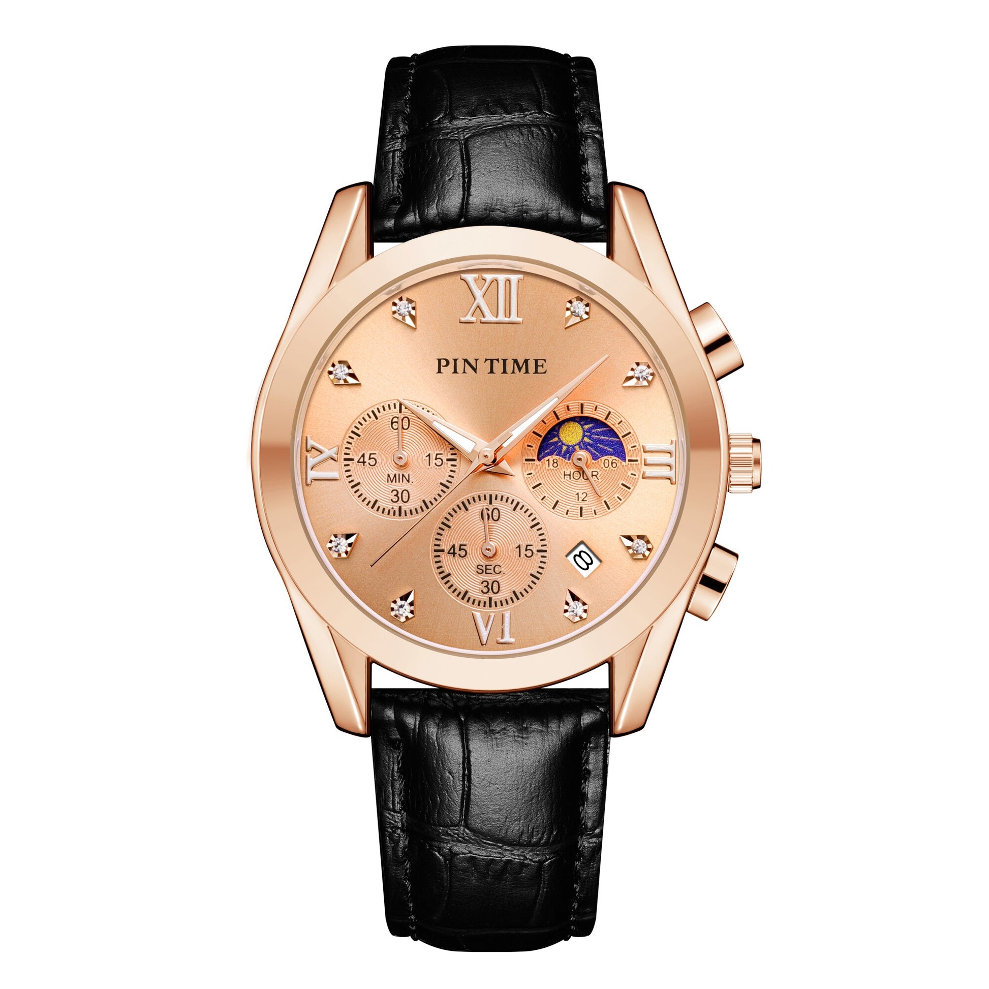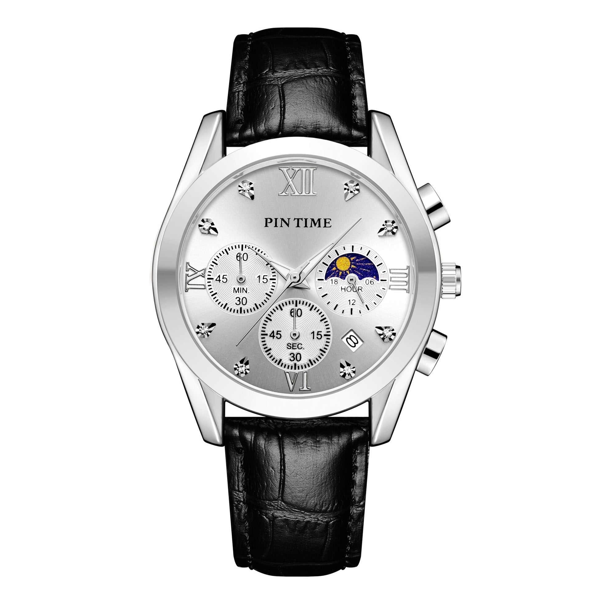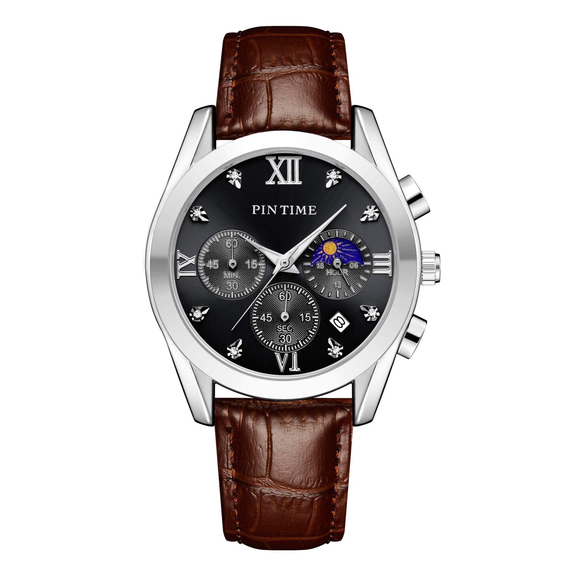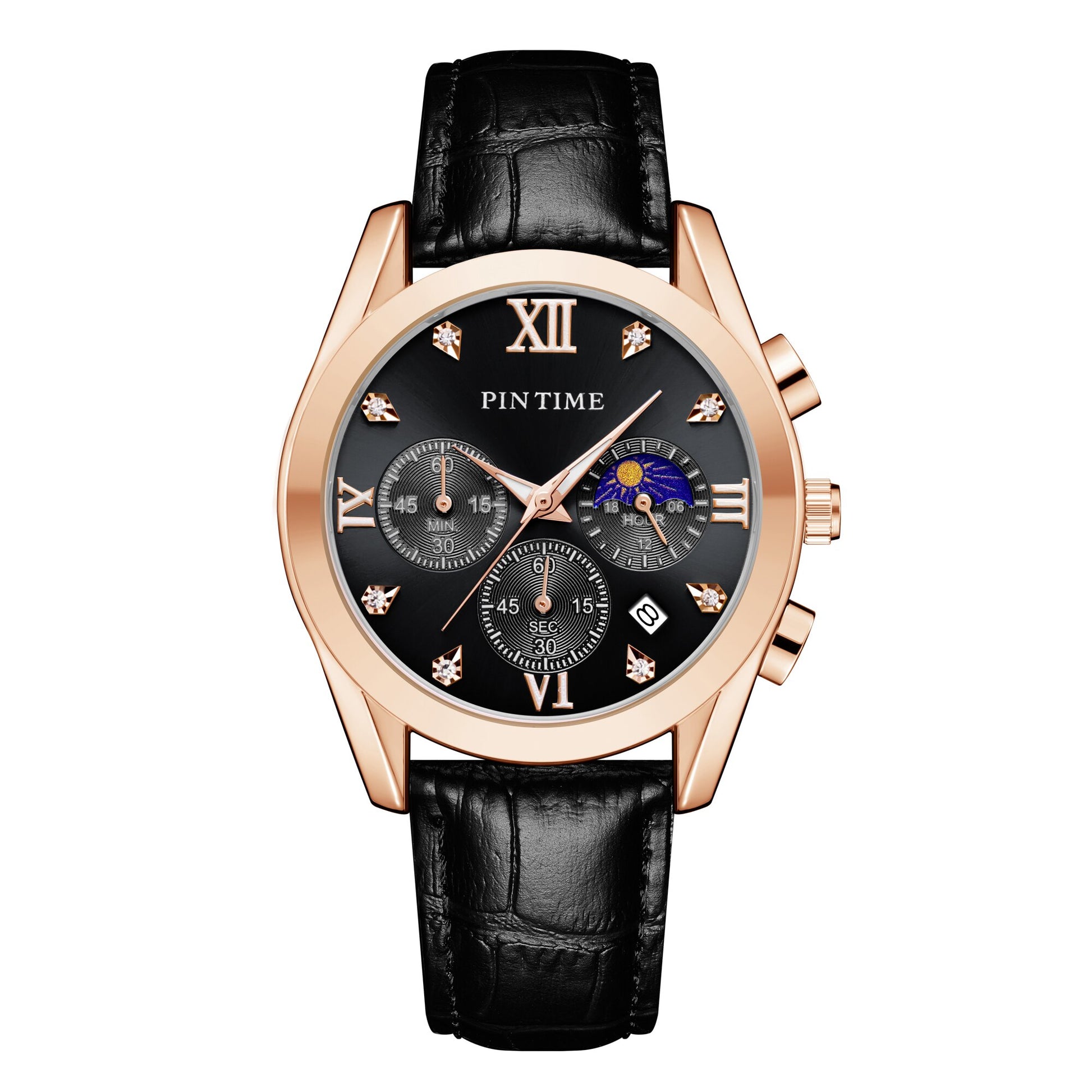 Men Casual Dress Black Watch Stainless Steel Moon Phase Dial Work Chrono Function Stopwatch Leather Luminous Waterproof