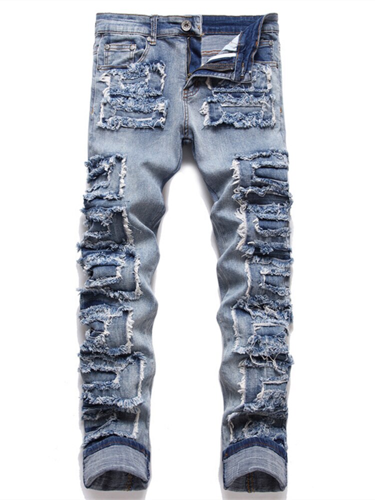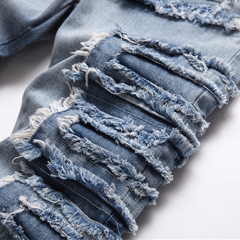 Trend Blue Hole Slim Seans Autumn Stickers Fashion Biker Pencil Pants Mid-Waists Casual Men Clothing