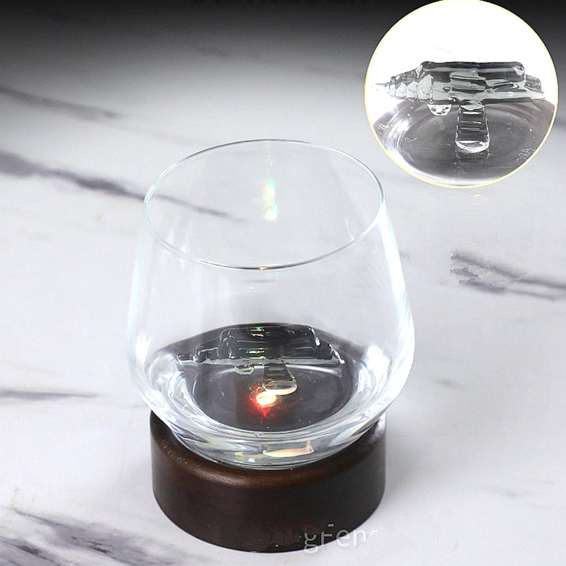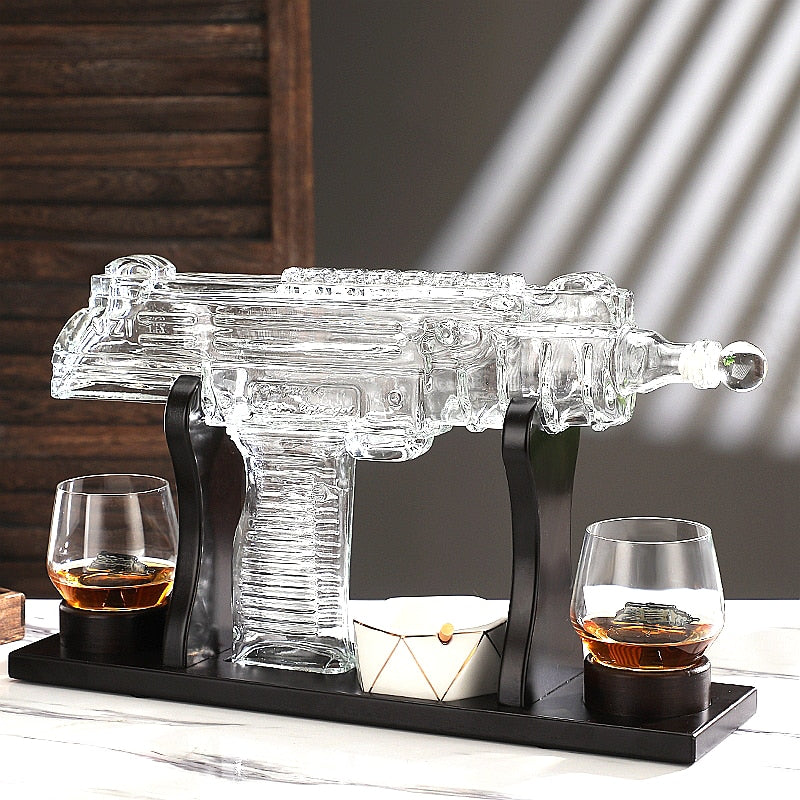 Submachine Gun Whisky Glass Wine Container Glass Decanter Set Drinking Vessel Wine Container With 2 Cups 1 Pine Wood Support